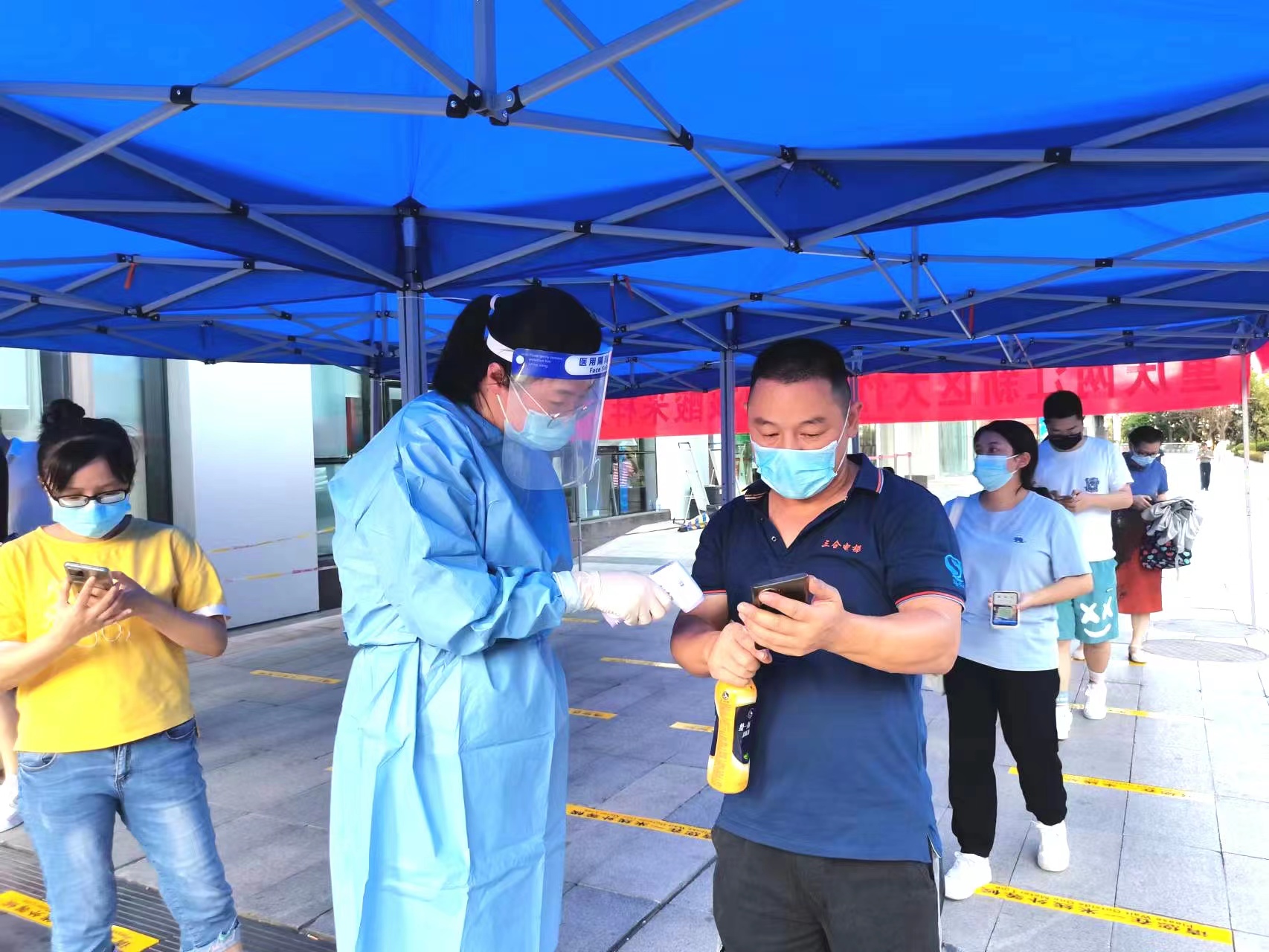 24日17:00 接续进驻。根据任务部署,第二批9名志愿者提前替岗轮换,确保团队及时进驻交接点位。从一丝不苟地开展核酸采样登记和样本冷藏精准分类存放,到耐心细致地为入口受检人员体温监测和有序引导外围人群流动,市国资委志愿者队员们各司其职,工作认真负责。