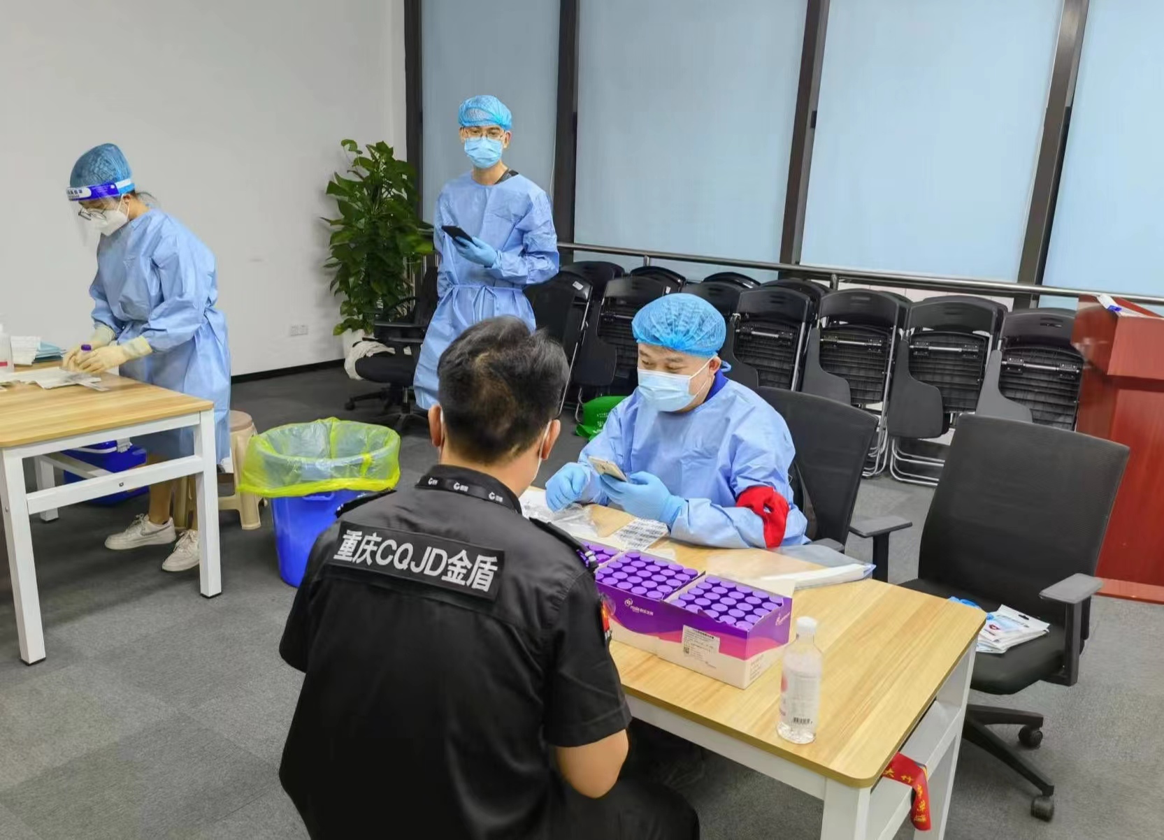 8月23日,重庆发布开展中心城区核酸筛查通告,市国资委机关党委迅即抽调15名机关党员干部组成志愿者服务团队,下沉星汇社区,支援核酸检测工作。